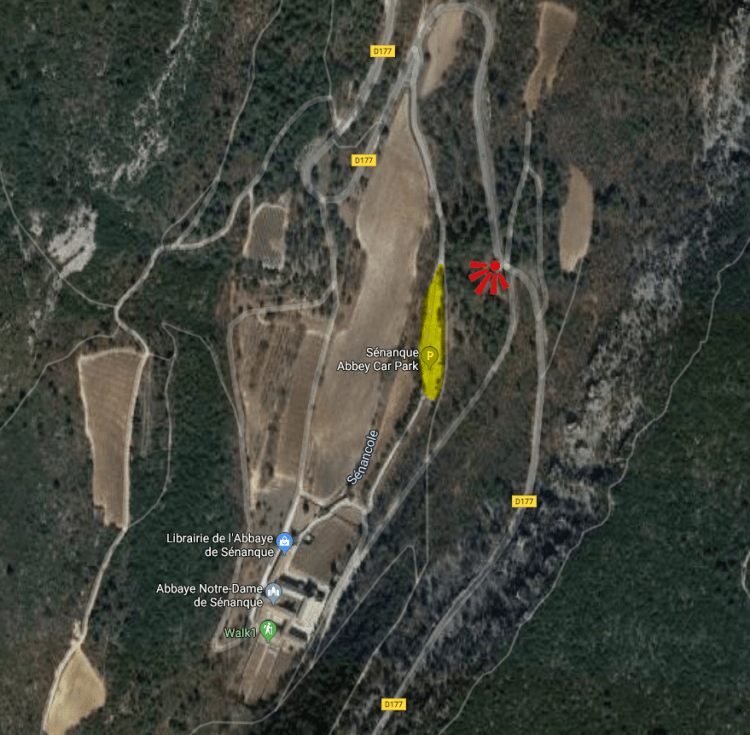 Wie auch nach Gordes empfiehlt es sich aufgrund der abgeschiedenen Lage mit dem Auto anzureisen. Vor der Abtei steht gratis ein großer Parkplatz zur Verfügung. Wer von Gordes her auf der D177 anreist, sollte unbedingt vor der Kurve stehen bleiben und von dort den Ausblick auf das Kloster genießen. Dieser Platz, im Bild unten rot markiert, bietet sich auch gut für eine Mittagspause an. Die Straße ist ab diesem Punkt bis zur Einfahrt zum Kloster im Sommer eine Einbahnstraße. Um zurück nach Gordes zu fahren, muss man einfach den Weg über den Klosterparkplatz nehmen.